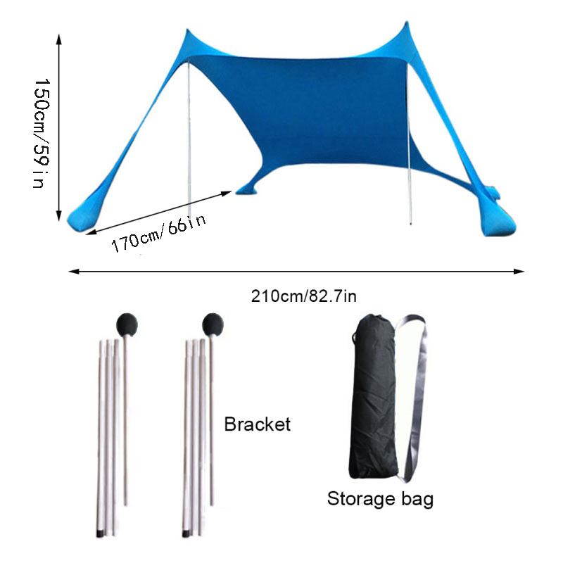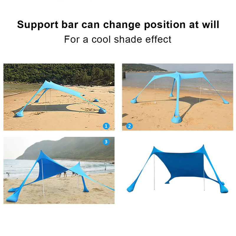 समुद्रकिनारी तंबू, चांगल्या सनशेड प्रभावासाठी सपोर्ट रॉडची स्थिती मुक्तपणे बदलता येते. upf50 स्ट्रेच फॅब्रिक, लवचिक, टिकाऊ, बांधण्यास सोपे आणि नेण्यास सोपे. समुद्रकिनार्यावरील उपक्रमांसाठी योग्य.